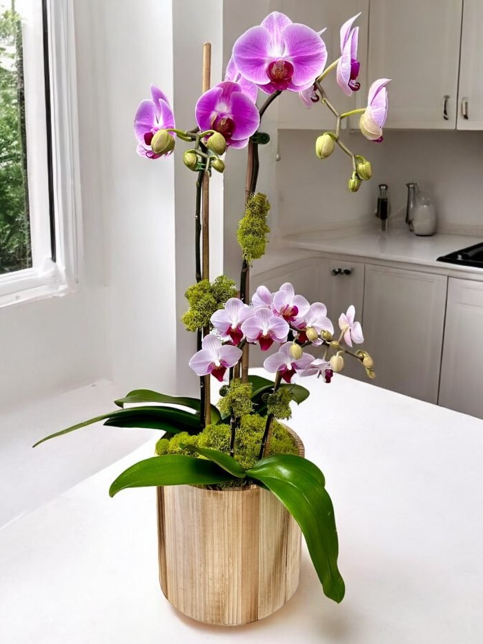 The Double Orchid arrangement is perfect for adding a touch of elegance and sophistication to any space. The natural beauty of the orchids combined with the rustic charm of the wooden container creates a stunning focal point that will surely impress your guests. Whether placed on a mantel, dining table, or entryway, this arrangement is sure to bring a sense of tranquility and beauty to your home. The vibrant purple color of the orchids adds a pop of color that will brighten up any room and create a welcoming atmosphere. This unique and eye-catching piece is a must-have for anyone looking to add a touch of nature and beauty to their home decor.
