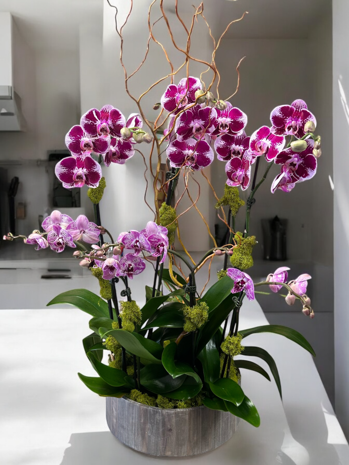 This exquisite vase of assorted orchids, elegantly arranged in a stylish wooden container, brings a touch of sophistication to any kitchen. The vibrant hues of the orchids create a stunning focal point, enhancing the overall aesthetic of your space while adding a refreshing natural element. Perfect for both everyday decor and special occasions, this floral arrangement is a delightful addition to someone’s home.