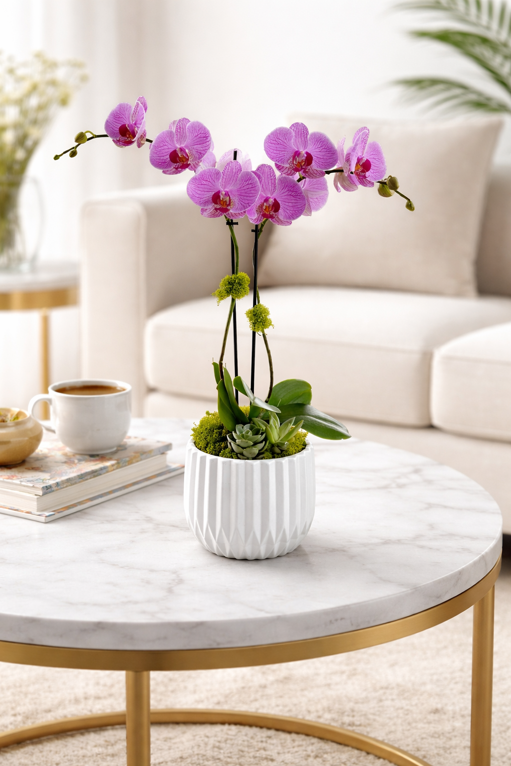 Celebrate Mom with elegance and lasting beauty through our Mother’s Day Double Orchid & Succulent Gift, featuring double stem phalaenopsis orchids paired with lush succulents, thoughtfully designed in a modern container with natural moss accents.