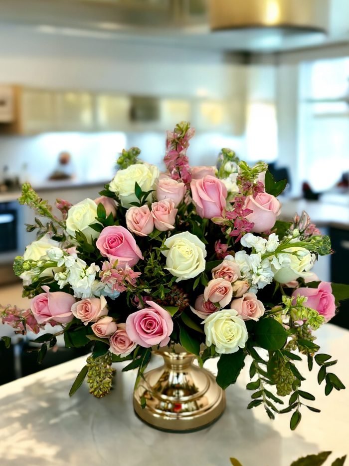 Elevate your Mother’s Day gift with our exquisite arrangement featuring premium white and pink Ecuadorian roses, delicate pastel color sprays mini roses, elegant pink larkspur, fragrant white stocks, and lush greenery all beautifully displayed in a luxurious rose gold metal pedestal vase. This stunning combination of blooms exudes elegance and sophistication, making it the perfect gift to show your appreciation and love for the special mother figure in your life. Treat her to a gift that will not only brighten her day but also add a touch of glamour to her home decor with this opulent vase filled with pink and white roses.