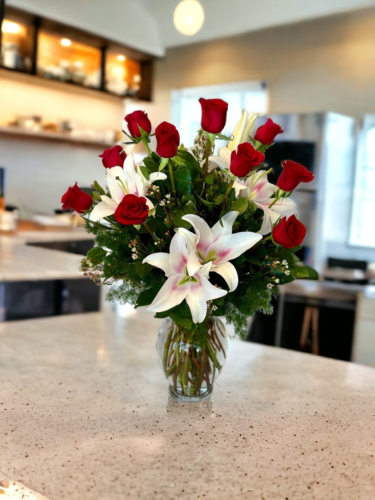 This gorgeous flower arrangement consists of 12 long-stemmed Red Colombian roses and the beautiful stargazer lilies in a minimalistic, clear gathering vase. This arrangement will surely make everyone who sees it fall for it.