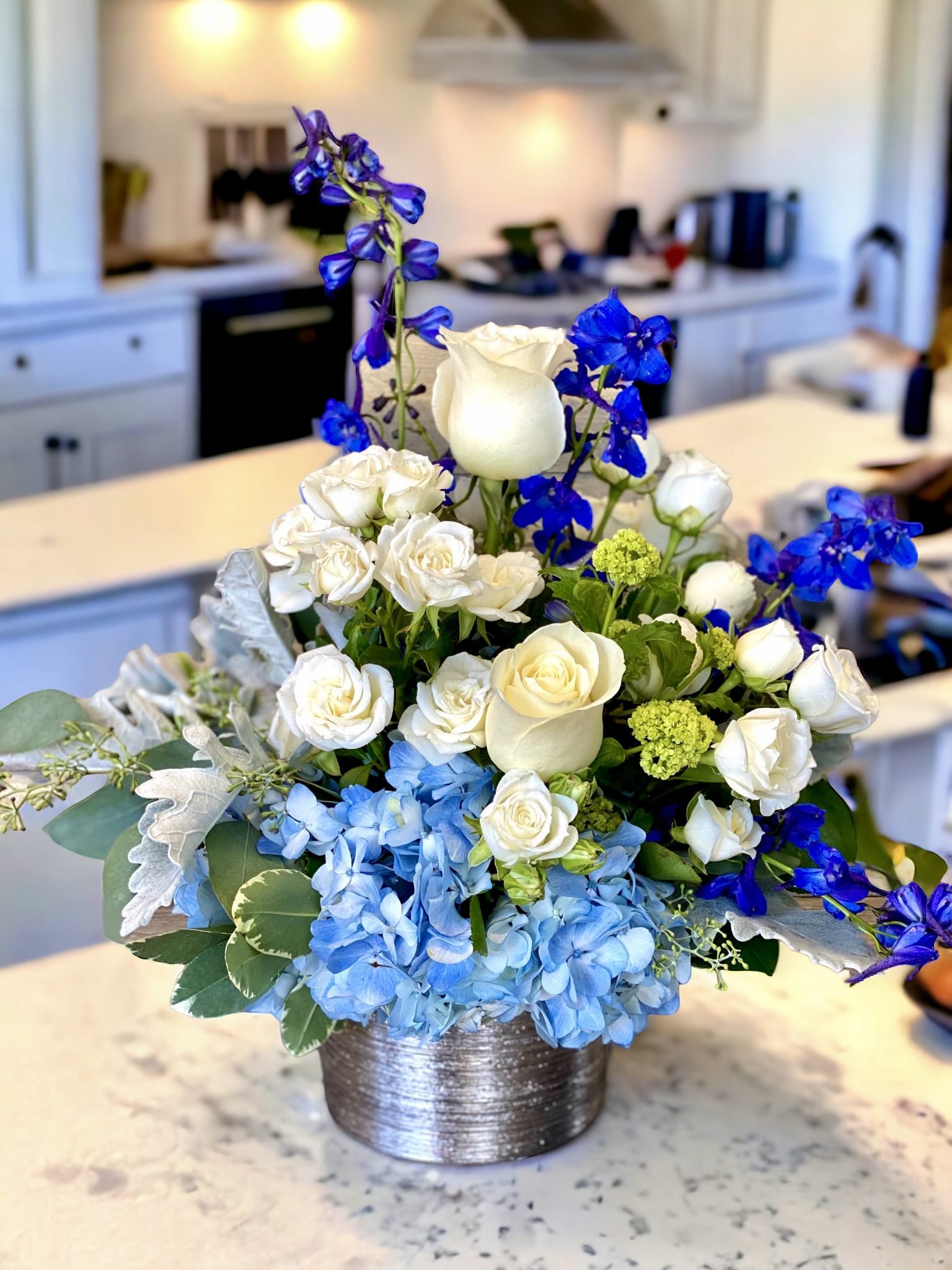 Flowers are the simplest way to brighten up a room, but add style and beauty to your arrangements with our “Satin” flower arrangement in whites and blues. Whether it’s for a birthday, get well soon, or just because you appreciate flowers, this arrangement is perfect for you.