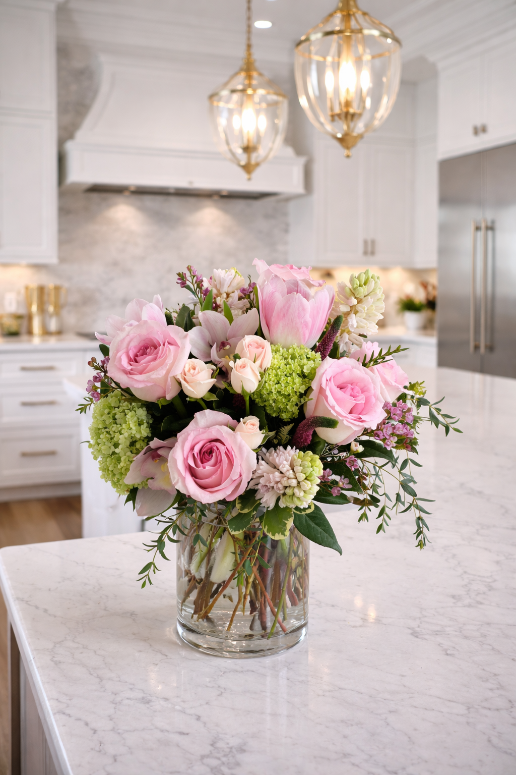 Transform your space with our exquisite vase arrangement featuring stunning pink Ecuadorian roses, delicate spray roses, and vibrant tulips, all harmoniously complemented by elegant cymbidium orchids and fragrant hyacinths. Nestled among lush greenery and charming filler, this floral masterpiece brings a touch of sophistication and natural beauty to any setting. Perfect for special occasions or as a delightful everyday centerpiece, this arrangement is sure to captivate and inspire. Elevate your decor with this enchanting display that radiates freshness and elegance.